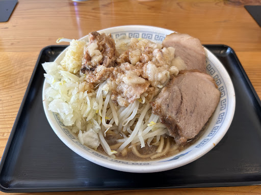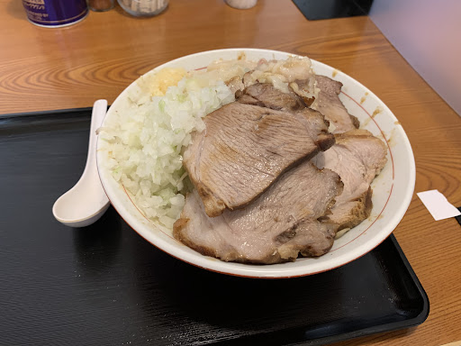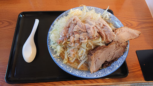Read more宮城県内の二郎系でかなり評判のお店。 いつも行列でなかなか入らないイメージ。 13時頃店前を通ってみると人がいなかったため来店。 中は満杯らしく外で20分ほど待ち入店。 汁なし豚ましとラーメンを注文。 さらに20分ほど待ち番号を呼ばれ、そこで始めたコールをする。 野菜はストップというまで盛られます。 後は辛み、玉ねぎ、脂、にんにくを好みの量でコール。 着丼し、一口食べる。 汁なしは味が濃い! むしろ濃すぎて味がわかりづらい。 それもそのはず麺にびっしりと味が絡んでいる。 麺は多少茹で詐欺なイメージだが味はいい。 野菜も茹ですぎ。 シャキシャキ感はない。 ニンニクと玉ねぎは行った日は辛く、匂いも強い。 全体的に味が濃く苦味が少し強めな印象となった。 豚は食べ応えがあり、柔らかくもあり、硬くもある。豚好きにはちょうどいい。 ただほろほろ溶けてくような豚ではない。 味のイメージとしてはセブンの豚そば汁なしにかなり近い。