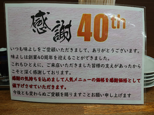 Read moreどうしても「味よし」のラーメンが食べたくて、ついついバイクでプチツーリングし、食べに行っちゃいました。 「味よし」と言えば、私の地元に約30年前頃まであり、当時よく通い詰めていた大好きなラーメン屋。そう、思い出の場所であり、思い出の味。 その「味よし」のあの味をどうしても、もう一度食べたくて、食べたくて、そんな思いで猪突猛進。 2025年10月2日 平日の昼下がり、13時に過ぎに初入店。平日の昼過ぎとあって、お客さんは数名程度で席は殆ど空いていました。 入店すると、すぐさま女性スタッフに呼び止められました。ここは、入店と同時にメニューを決め、会計してから席に座るというシステムでした。私は、思い出味、そう普通のラーメンで「チャーシュー麺 大盛り 細麵」をチョイス。料金は1300円弱だったと思います。 そんなに待つ時間無く、待望のラーメンがカウンター越しから私のところへ。そうこの甘い香り、透き通ったスープ、白ネギに青のり。私が食べたかった「味よし」のラーメン。 ひとくちスープをすするとあっさりとした味の中にすっきりとしたまろやかな風味があり、旨い、もうひとくち。細麺ちぢれ麺を口に入れると、スープと交わり、旨い。チェーシューはホクホクと柔らかく旨い。「味よし」で私の食べ方は、(カウンターにある)ペースト状のニンニクをこのラーメンにのせ食べるのが本当の食べ方。ニンニクをのせると味変して、さらにおいしい。ついつい5杯くらいニンニクをのせ、食べてしまいました。...