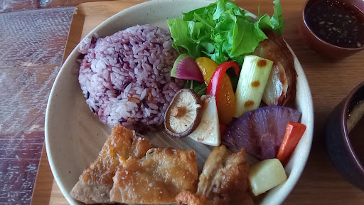 さて、お料理ですが今回私はアキウ舎ランチです。 焼肉のタレのようなものが付いていて、プレートのお料理全部に掛けちゃいます。 カラフルなお野菜は柔らかくてとても美味しく、 ゴロッとした鶏肉3切れも皮はパリッと中のお肉は柔らかで、タレとよく合います。 紫黒米?は無味なので、こちらにもタレをかけると美味しいです。