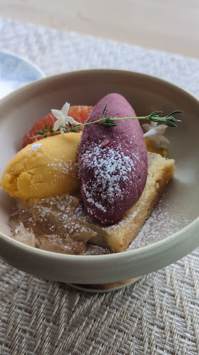 お料理は盛り付けは良かったです。 お味は薄目の味付けで、全体的にさっぱりした印象。 私は、ここのオリーブオイルの香りと味が苦手でした。 パンのお代わりがあったので良かったですが、出されるタイミングは残念でした。 仙台牛のイチボステーキは肉質か硬めです。 お肉のソースはもう少しこくのある方がコースの〆としては良いかなぁ。 デザートはソルベやアイスとロールケーキが一緒に盛り付けてあるので、早く食べないとアイスが溶けてせっかくのロールケーキがぐちゃぐちゃになります。