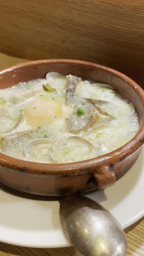 「ポルサラダ」…バスク地方の郷土料理。 ネギのスープとして有名。このランチは塩鱈を入れたバージョン。ニンニクの他、タラの白子が入る贅沢版。基本、ただ野菜を水と塩で煮込むだけなのだが、これが美味いんだな。とても滋味深い。