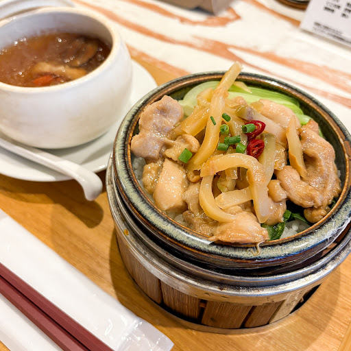 セットの蒸籠ご飯は、柔らか鶏と小松菜が乗ったものでした。煮込まれた鶏肉には優しい旨み、アクセントに小松菜。優しい味付けで、胃に負担をかけずに満足感が得られます。米も少し硬めで満足感あります。