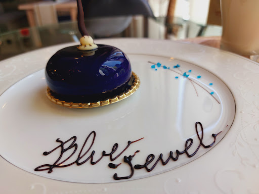 これは、ちょっと?と思ってしまいました。 何か意味があるのなら、ごめんなさい。 青いケーキのブルーベリーの群青が、 とてもキレイなので、 白を入れると引き立つからなのですかね? でも、私の感覚からすると、 せっかくのシックな群青色のケーキが、 かなり、子供っぽい感じになってしまって、少々残念。(すみません。)