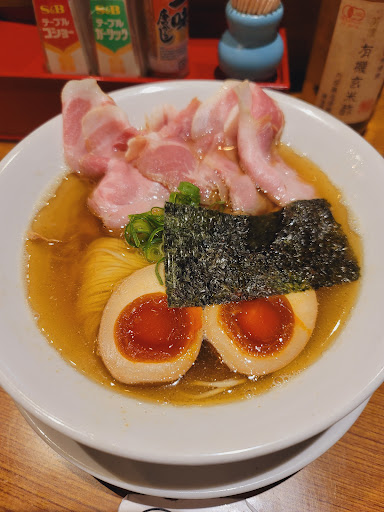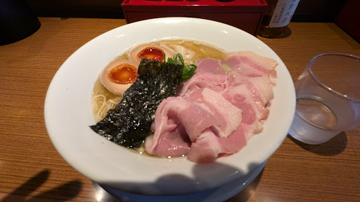有名店であるという事は周知していたが、今さらながら初訪してきました。決して町の中心部ではないが駐車(輪)問題や荒町としての歩道の狭さゆえの行列(並び)問題、2人横並びで一杯になる歩道の幅からくる歩道上の歩行者問題、お店には関係ないが自転車の逆走、無灯火、自転車道を妨げる駐停車する車両、信号機ナシの横断歩道箇所が多数と、とても気を遣う地域なのだ。しかし、こちらのお店、店舗前に駐車可能スペースが1台分以上あるくらいの(実際には1台停められる)並びスペースがあるのは良い。実際には駐車する車が来るかもしれないので左側に列を作るのが良いみたい。■開店15分前に到着するも誰もいなくて そのまま素通りして回りを1周。。。5分くらい前に到着すると2名が店舗前に。一安心して並ぶ(初訪でPPは無理ぃw)。その直後に2人組。。。その後も数人並んだような。。。あんまり後ろを振り向いたりしないので不明。開店時間になり女性スタッフに声を掛けられPPの人から券売機で発券して左の奥へ着席。3番目の俺は特製白ふじと味付き替え玉を発券して奥から3番目へ。その後は「券売機の近くなので右奥へ」と誘導されててました。何という心遣い。しかし、正直言うと「コ」の字型のカウンターって苦手。■スマホをイジってると配膳されたラーメン。どんなお店でも初対面の瞬間とスープを一口飲んだ瞬間が好きだ。もちろんゲンナリする事も多々あるが(笑)。正直に言うとインパクトは少ない。それでも丁寧なラーメン作りはしているなぁ~と。そして気配り満点の女性スタッフの声掛けが人を「もてなす」感があって心地良い。■替え玉をお願いするタイミングを見計らって、そろそろかなぁ~と思って食べ進めていたら「替え玉作りますか?」と声を掛けられ咀嚼していた俺はウンウンと頷くだけw...