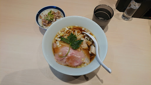 Read more楽しみにしていた4号店に初訪問です。 3号店が個人的に残念だったのと、メニューの面白さが相まって期待して入りました。 その店内はとてもキレイでラーメン屋さんという感じはしないですね。 まず入り口の券売機で購入したのは、オススメと思われる本枯節の王道中華そばと炙り肉めし。 すぐ席に通され混む前に店に入れて注文したので、すんなり着丼です。 運ばれてきて撮影しましたがその時から素晴らしい香り。 スープからいただくと…、うまい! 鰹の風味が素晴らしい!これはいい!期待して入店したかいがありました♪ ネギもかなり粗めに切ってあるので、そこまで主張せずにアクセントになってます。 麺は他の店舗と一緒ですかね?この細麺も安定の美味しさ! チャーシューは二種類。ローストポークと角切りのバラ肉。 バラはトロトロ、ローストはやわらかでうまい。 肉炙りご飯はコスパが素晴らしい。これで100円か…。 あんまり口コミ良くないですが、個人的にはとても美味しかったです。 味噌と二郎系は食べてみたいので、あと2回は来ないとね! ごちそうさまでした。