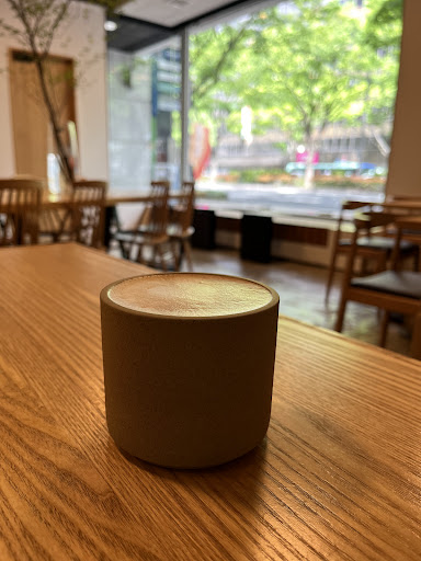 無機質✖️ウッディで超おしゃれだし 大きなガラス窓の外は新緑がとても綺麗。 朝の涼やかな光も、日が登って来た感じの強めの光もきれい、、、 時間の移り変わりも素敵。ラテもすごく美味しくて、のんびり。居心地よかったよ。