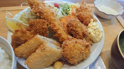 シェフも奥様も高齢ということもあってか、中々お店が開いているところを見かけませんでしたが、漸く伺うことができました。ミックスフライを注文しました。立派なエビフライ2本、ヒレカツ1枚、鶏のフライ1コ、牡蠣フライ1コ、クリームコロッケ1コにサラダ、ご飯、味噌汁、お漬物、食後のコーヒーという内容です。見た目、凄い量です。食べてみると衣サクサクであまり油を感じず、スイスイ食べられます。下味もちゃんとついていて、ヒレカツでもソース不要でいけます。私は先日まで都内在住でしたので、これで1200円はあり得ません。この質と量だと都内だと1800円くらいでも不思議ではないです。メニューも豊富なので何度でも再訪したいです。狭い入り口とは異なり、店内は明るくて広々しています。 追記:豚肉の生姜焼き定食1000円とカキフライ定食1200円もいただきました。量も味も素晴らしく、お値段はやはり信じられないですね。本...