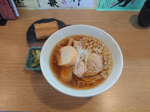 Read more平日の12時過ぎに訪問です。 先客は1名だけ。ちょっと寂しい店内ですね…。 メニューを見てオススメと思われる、煮干しそばプラスいなり付きの麺大盛で注文です。 お冷やは水ではなくお茶をだされ、その後に冷えたおしぼりも出されました。これは嬉しいですね。こういうサービスはありがたいです。 そして5分ほどで着丼です。 見てて思いましたが、麺の茹で時間はかなり短いみたいですね。茹で始めたと思ったらすぐブザーが鳴って、麺を上げてました。 早速スープからいただくと、あっさりもあっさりで塩分もかなり少な目に感じます。煮干し感もそんなにありませんでしたので、ニボラーは普通ではなく濃いめ以上にしといたほうが良さそうです。 麺は極細ストレートでツルツル行けます。茹で時間短くても全く固くありません。 メンマも丁度よい固さでアクセントありますし、チャーシューも二枚入っていますが、柔らかく薄味に仕上がっていてスープとマッチしてます。 いなりは特段変わりもしない普通のいなりでした。 総合的には美味しいのですが、普通の煮干しそばは、かなりあっさりで控え目なラーメンでしたので、人それぞれかと思いますが濃いめ以上の煮干しそばのほうがいいのではと思いました...