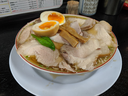 Read more以前から前を通る度に長蛇の列が出来ているのを見て気になりまくっていた御店。 並ぶのが嫌いな俺達夫婦ですが今回は意を決して並ぶ事に。 因みに此方の駐車場は丁度店舗向い側にある車7台駐車可能の専用駐車場が有り店舗の壁に案内の看板が有ります。 ソレとは別に、その駐車場隣辺りに有る、ほんじつ大漁と言う店の前の駐車場3台分が平日と土曜日の日中、日曜日に関しては全日駐車可能との案内が店内のカウンターと自動販売機の側面に分かり難い感じで案内されています。 イズレも店舗向い側にある駐車場の為にどうしても道路を横断してしまいますが、スグ近くに信号機が有りますのでソチラを使いましょう。 自分は道路を横断してしまいました。反省。 訪れたのは土曜日の昼を過ぎた頃合いでしたが、やはり10数組の行列。 最後尾に並ぶと店員さんが出てきてメニューを渡して貰いました。 決まった頃合いで、又店員さんが出て来られて注文。 するとそのまま店内に案内されて事前に精算。 前払い制でした。 券売機で購入させられるより、俺はコッチのシステムのを断然支持します。券売機は好かん。 嫁さんは煮玉子入の中華蕎麦に俺は煮玉子入のチャーシューモモ肉蕎麦を注文しました。 注文後に順番が回ってくるのを待つ間にも次から次へと列に人が加わり相当な人気が伺えました。 店舗の硝子には物凄い数のステッカーが貼られているのですが、よく見ると某有名番組のステッカーも数枚貼られていたり、ラーメンのグランプリか何かのステッカーも見受けられたので、人気の理由が其処ら辺に有るのが予想できました。 列の回転はとても良い感じで店員サンのサバキ方が素晴らしいのと、前払いで待ち時間を有効に使えている事の効果が表れてるのかと思います。 店内はカウンター席大体15席位。 実際に運ばれて来る早さは普通やや早め。 店の方の動きは無駄なくキビキビしていて活気溢れる感じで好印象。 ラーメンの見た目は丼スレスレ迄に注がれたスープと麺を多い隠す程のチャーシューに先ずは目が行きます。 麺は俺の大好物の細麺。 期待に旨を膨らませてスープを一口・・・・・ン? 次に麺を一口・・・・・ん? そしてチャーシューを一口・・・・・ん~~? ん~~行列で期待値を上げ過ぎてしまっただろうか? なんだろう?美味しく無い訳では無いけれども俺の口には合わなかったかな。 特にチャーシューは全く俺の好みでは無かったのが残念。 ドカンと厚切りチャーシューなのだけれど良く言えば歯ごたえ抜群、悪く言えば硬くてモサモサ。 麺は見た目ボリュームが凄くてちょっと食べ切れないかな?と思ったけれど熱さが適当でスルスル食べやすかった印象。 スープも美味しいんだけれども。 感想としては、どうしても、ん~~?って言う感情が最後迄残ってしまいました。 イヤイヤイヤ、美味しんですよ? 俺の好みの話だけれども・・・・多分チャーシューかな~。 嫁さんの評価は☆3つから☆4つ位との事でした。 因みに小食な嫁さん、食べ切れるか心配して見てましたが、余裕で食べ切ってました。 やはりスルスルと食べやす...