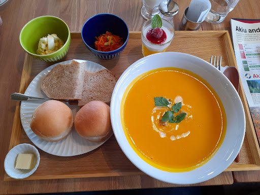 The place is right in front of the Saihoji Temple. The soup and home-baked bread set was perfect for lunch! For soup, I was able to choose from carrot pottage or ginger soup (I chose the ginger soup). I was a bit hurry so I asked to bring the coffee with the meal. Maybe a bit pricy (1,700yen for the set meal) but you can have a warm meal with a...