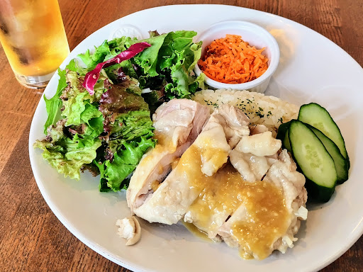 ランチにドリンク、デザート、ドリンクとデザートのセットも選べます。 デザートもおいしそうだったのですが、かき氷が気になったのでドリンクセットとかき氷にしました。 選んだごはんセットはカオマンガイです。カフェのランチはきれいで量が少なめのイメージ。でもこちらは違いました。写真ではわかりにくいかもしれませんが、鶏肉もその後ろのごはんもボリュームたっぷり! 甘めのソースが鶏肉とごはんにとても合います。 サラダのドレッシングもおいしく、キャロットラペも箸休めにぴったり。 かき氷はふわふわの氷。ちょっと小さめサイズなので食後にもいけました。