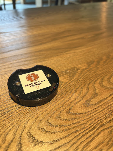 メインレジに着き、店員さんも何だか余裕が無さそうな様子…しかし、オープンしたばかりですし、そこは特に気になりませんでした。かえって、誠心誠意対応していただけて、ありがたいくらいでした。 注文を終え、空いている席へ。席を決めてから注文されている方が多かったので、店内飲食をするぞ!という方は予め席を確保されてから注文に向かうと良いかもしれません。 呼び出しブザーを持ち、待つこと数分…ようやくご対面です。今回は、プリンアラモードとベリーのパフェ、みかんジュースと、猿田彦のカフェラテ(ホット)を注文したので、運ぶものがいっぱいです(笑) 運ぶ際、小さな木製のトレーで運ぶので、周りのお客様にも気を付けて運ばなくてはなりません。