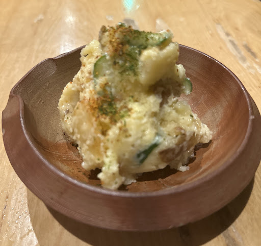 さて、先ずはポテトサラダ これも、凄いです。 ジャガイモの皮を直前に揚げているようで その食感や、香ばしさ、旨味の相乗効果 素晴らしい じゃがいもなのに深みがあるのは どうやら調べてみると数種のじゃがいもを直前に混ぜ造るようです。 更にネギにより和も混ぜた独自の美味しさに仕上がってます。 このコストでこれは凄い。