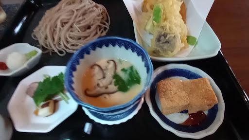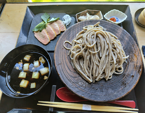 Read more前から気になっていたお店!妻からも行ってみたいと言われて、平日のランチでお邪魔しました。 予約ができなくて、人気店ということで早めに到着、一番乗りで店舗前の駐車場で待機😎 少し早めに開店して頂き助かりました🥹 店内はレトロと和と洋が融合したような空間で、案内された2階は大きなガラス窓からの眺めも最高です♪春の若葉や雪を見ながらの食事も良いでしょうね。 迷わず窓側のカウンターを選びました🥰ジャズが静かに流れていて、とても居心地が良いです。 初めてということで、二人とも一押しの玄挽き十割蕎麦御膳をオーダー! 提供が早い!😳お茶と塩豆を楽しんでいると、あっという間に配膳となりました😆 やっぱり盛り付けが綺麗ですね。蕎麦も艶々して美味しそう。他に天ぷら🍤、鴨のロースト?茶碗蒸し、わらび餅が付いて充実の内容です! 何もつけずにひとすすり。シャッキリ締まって風味も良いです。次におすすめのフランス産岩塩をパラリとして二口め、お互いの素材の良さを高めあって美味しい😋 ツユは割とあっさりで、塩味、甘味を抑えた感じ。蕎麦の風味を活かすためかな🧐薬味はワサビ、おろし大根、カンズリ(これは珍しい)。きざみネギが無いのは香りが強すぎるためか? まずツユに薬味無しで、次にワサビをチョイと足してみて、更におろし大根を投入、続いて蕎麦にカンズリをつけてパクリ😍どれも美味しい😋いろんな風味で楽しくなってくる😊鴨や天ぷらも間に挟んで豪華なローテーション!茶碗蒸しも出汁か効いて上品なお味。デザートのわらび餅はふるふるプニュプニュで味も食感も心地よい。 天ザル蕎麦が千7〜8百円するご時世、2千百円でこの空間でのひと時と料理の内容はお得だと感じます。今度は白の十割蕎麦御膳をいただきに伺おうと思います。