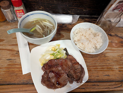 Portions of grilled beef tongue with miso soup & rice at a veteran, no-frills spot with low tables.