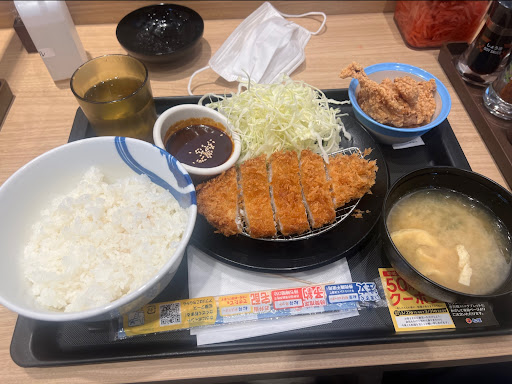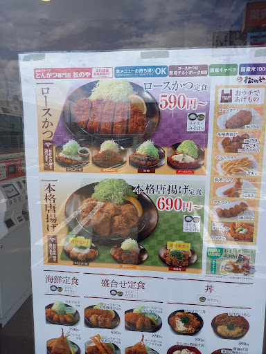 厚切りの注文してた時の話なので前の出来事ですが注文しても間違えてる事が多々ある。 200~300円近く高く払って間違えられるのはね。 食券、見てるし見た目で厚切りじゃないから揚げてる時に間違えてるの気付くだろうに普通に出して来る。 特に深夜の持ち帰り弁当で厚切りで注文すると間違えてる事が多い。 そんなに小分けにしなくても良いのに毎回、持ち帰りのビニール袋が4つも5つも付いてくるのは、無駄。 セルフのお茶は死ぬ程、味が薄い。 ほぼ白湯。 ※ダブルロースカツのチーズトマトを食べてみましたがトマトのタレが水分が多く味も薄かったです。 890円だったので、おろしとかの方が良いですね。 ロースカツの両端側が固いです。 ご飯と味噌汁のお代わり自由になってましたが、ご飯大盛で注文すれば結構な量です。 安く多く食べたい方、向けです。 前にあった厚切りの豚カツと、ご飯特盛は、なくなってます。 キャベツが無駄に多いです。 QR払い出来るのは、良いです。 ※海老フライ+2本付きで840円で食べれる時には、良く行きます。 海老フライが大きくて美味しいです。 ご飯と味噌汁のお代わり自由なのと海老フライ+2本付きの時は、良く利用するので星2にしときます。 業務用の食用油の値段が爆上がりしてるから値上がりするとは、思いますが。 ※Twitterのフォロークーポンで海老フライ2本+ロースカツ定食で860円だったので来店したのですがタルタルソースが付いてなかった。 前まで付いてたのですが。 多分、店舗内が混んでたのでタルタルソースの付け忘れだと思います。 かつやでも付け忘れされたので。 海老フライも小さくなった様な気がします。 タルタルソースで海老フライ食べたかったので残念です。 平日の夕方でも店内、混んでます。 店内10人位、他に食べてる客いましたが待ち時間15~20分位ありました。 弁当の持ち帰りで6人位、並んでました。 店員2人だとキツイ様な気がします。 持ち帰り弁当2個、買ったら袋4つもありました。 サービスクーポンのコロッケ1個を入れる容器が凄く、でかく勿体ない気がします。 タルタルソース付かなかったので星1にします。 松屋のアプリから松のやのクーポン取れるので590円の定食500円に出来ますよ。 弁当の持ち帰りだと、ご飯大盛にすると何故か60円も高くなります。 牡蠣フライ1個増量の時に食べに行ったら、ちゃんとタルタルソース付いてきました。 海老フライの時は、付け忘れだったの確定ですね。 ※個人的な要望です。 券売機2台の設置は、無理ですか? 松屋と同じ券売機だからキャンセルが凄く面倒臭いです。 券売機待ちで並びます。 ご飯と味噌汁のお代わり自由にしてるのは、松のやは全部、一緒だから夜が滅茶苦茶、混むので。 夜の店員の配置、増やせませんか? 夜に2人しか店員いなかった時、持ち帰りも店内の食事してる客も店が回ってなくて凄い人数でしたよ。 ※ワンコイン500円セールになってたので持ち帰り弁当にしてみましたが元々ある590円の定食の豚カツで、 新しく肉の厚みがある豚カツじゃなかったですね。 松屋のアプリから松のやのクーポンを検索すると定食は、500円になるので特に、お得感は、全くなしでした。 平日の昼過ぎ頃でも店内、座る所ない位に混んでました。 持ち帰りの弁当にすると、ご飯大盛は、やはり60円も高くなるので時間があるなら店内で食事した方が良いですね。 ご飯+味噌汁のお代わり大丈夫なんで。 持ち帰りの味噌汁も必要なら別途60円かかります。 持ち帰り弁当の方が...