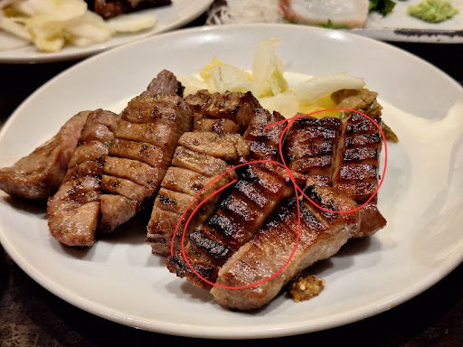 I had a family trip to Sendai on 8/6, and Zenjiro really destroyed my imagination and experience about the famous beef tongue in Sendai. Because the price of beef tongue is high, maybe I put a too high standard to Zenjiro. I've searched that Zenjiro had a very good reputation online, and that's why we chose it for our big meal of the trip. The service there is okay. We arrived at early afternoon, so not too much waitng for a 5-people seat. Waiters service is polite and good. And you don't need to speak good Japanese to order. The food is what goes wrong. I don't like to leave bad comments to shops, and usually is wishing they could do better next time. The beef tongue itself was awesome. BUT, several pieces of our meat was BURNT. You may obviously and only emphasise on the taste of bitterness when you expect some delicate, smooth sweetness and tenderness hug of beef tongue. The picture is when the dish is served, which has a better side upside. One can easily tell the color difference. The back side is even darker, but my parents didn't let me to report to the waiter.(Of course another reason would be the difficulty of communication) And probably the worst is that the burnt even also occur in the best quality dish "極厚真中たん".