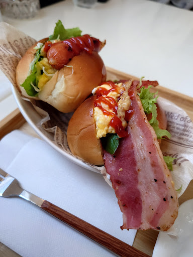 Read more○ホットドッグ 長いソーセージかと思いきや バターロールにソーセージとベーコン 挟んだ可愛らしいホットサンドが2つ 軽食にぴったりなサイズ感 これにサラダとドリンク付いて650円 お財布に優しいです