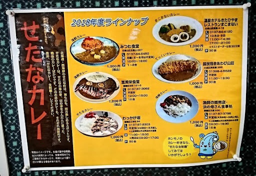 普通に定食を注文しようかと思いましたが、町内の飲食店数軒が賛同する町おこし的な「せたなカレー」にしました。特に厳格なレギュレーションは無く、地元の海の幸、山の幸を使えばOKみたいです。「海鮮カレー」1,000円は祭りの屋台的な焼きイガと小さめのホタテが2つ。カレーからはシーフードの味は一切せず、ノンスパイシーの甘口。ややしょっぱい。北海道の観光地でよく見かける毛ガニを乗せたラーメンと同様、料理とトッピングが何の相乗効果も産まない、単に乗せただけのやつ。一緒に出てきたスープは化学調味料強めでこちらもしょっぱい。店のおばちゃんは...