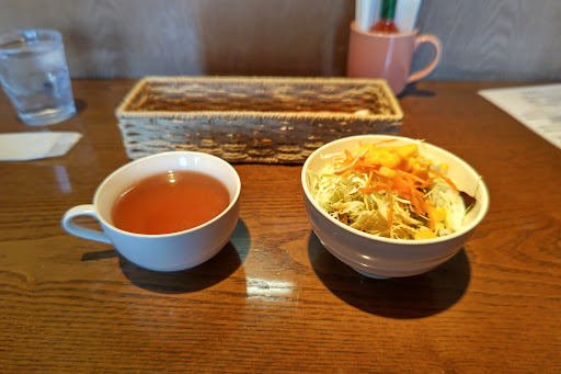 味は昔ながらの優しい味の卵、味薄めのチキンライスに濃い酸味のケチャップ、さっぱりとしたホワイトソース。まさに洋食屋さんのオムライスという感じでおいしいです。コンソメスープも手作りのようで味が濃いめ。サラダ・ドリンクは店内のメニューから好きなものを選べます。(一部プラス料金。)