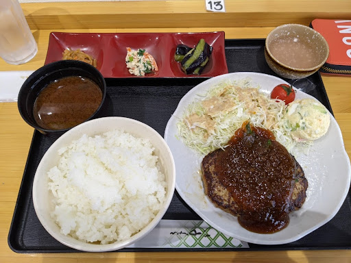 結構早く来ましたね。しっかり火を通されたハンバーグはふんわりしているけど結構肉々しいw おろしに醤油ベースのタレがもう入ってるのね、味が濃い目でご飯が進む。千切りキャベツはごまだれがたっぷり、ちと多くないかw...