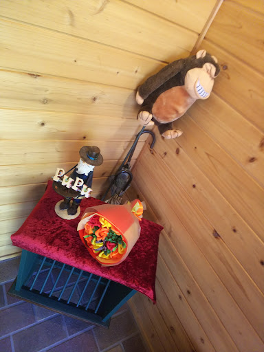お店は階上にあるさかい見上げる感じ(´-)階段途中からしてとてもメルヘン(´-)と思いきや上りきったテラス席に鎮座してんのはホネホネロック君!!(⊃ Д)⊃≡゚ ゚エェッ!!アベックでお出迎えだがネ(*´-