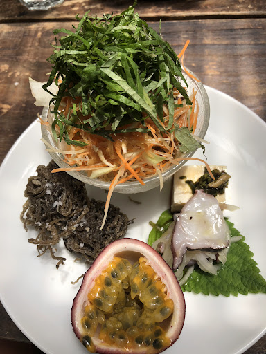 2週間の奄美旅中に二度ともチキンカレーセットをいただきました。 自家製のサラダ、タコの醤油マリネ、もずく天と、どれも丁寧な手作り感があり、とても美味しかったです。 パッションフルーツも付いていました。
