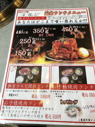 Read more出先でランチ時になり、地元の人気店らしいのでふくざき丼を目当てに出没。 ランチメニューが充実していて 焼肉の肉タワーランチの250gに ホルモン小盛りのふくもつセット(¥300)を付けました。 地元の精肉会社が運営しているお店だけあって数種類混ざっている肉のタワーで美味しく焼肉を堪能出来ました。醤油ダレと味噌ダレの他に席にポン酢しょうゆと特製ゴマ塩が有ります。特製ゴマ塩が肉の旨味を引き立てつつもしょっぱ過ぎず気に入りました。 ホルモンを付けたので150gでも良かったかなーと思いますがガッツリ系な人には450gの9センチのタワーも有ります。 量よりも質な人には極旨カルビランチがオススメとの事。 また1ポンドのサーロインのどぇれぇステーキも有りますが、こちらも量より質な人には柔らかいヒレのごほうびステーキがオススメとの事でした。 ランチにはフリーのコーヒーが付いているのも良かったです。 またふくざき丼やステーキを...