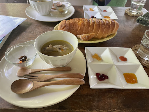 パンとピザとスープのランチで、何よりパンが美味しい!ジャムをつけて食べるのですが、そのままの味もとても良いパンです。 また、スープもピザも美味しく、味わってゆっくり食べました。 外の景色はアニメのような風景でみかん?の周りに蝶などの虫たちが飛んでいて窓は不思議なスクエアの空間です。