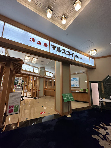 夕食会場のマルスコイへ。受付を済ませ、席に移動。とっても広い空間にエリアごとに分かれるブース。