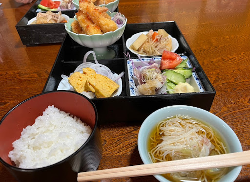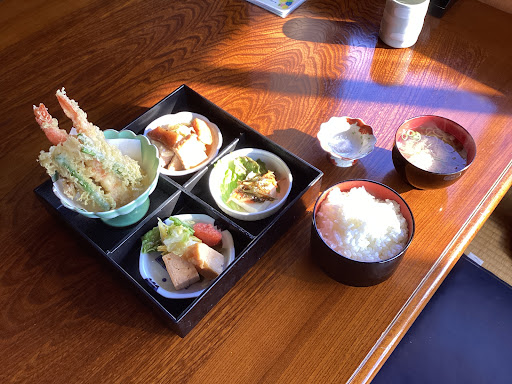 2024年12月19日にランチで12:35くらいに訪問しました。 こちらもGoogleマップで見つけたお店です。 見るからに普通の一軒家です。向かって右の土地が駐車場です。 玄関ドアを開ける前にインターホンを押します。 中から配膳と会計担当の女性の声が聞こえたので開けて入ってみます。 個人宅の造りなので靴を脱いで玄関を上がり、席は畳に座敷テーブルです。座敷イスもありますので畳に座るのが苦手な方も大丈夫ですね。 お昼ご飯は「おまかせランチ」のみです。今日は天ぷらのようです。それのご飯大盛り(サービス)を注文しました。 10分強くらいで配膳されました。 先ずは、ご飯とお味噌汁と天ぷらに付けるお塩がきて、すぐに四つに仕切られた重がきました。 天ぷらは、揚げたあつあつです。海老が2本、しっかりとしています。大粒の塩がよいですね。 豆腐の上に松前漬け(たぶん)がのったものは、初めて食べましたが、とてもおいしいですね。 だし巻き卵と明太子も、ご飯が進みます。 煮物は、とろみがついています。やさしい味付けで練り物や角煮の豚肉がさっぱりいただけます。 食後にコーヒーとデザート(この日はみかん)が出てきます。みかんは皮を器にしていて手がかかっています。 終始、女性店員さんが丁寧でした。 これで税込み1,000円とお値打ちです。仙台市中心部だと1.5倍はしそうですね。近くにきたらぜひとも再訪したいですね。 おいしくいただきました...