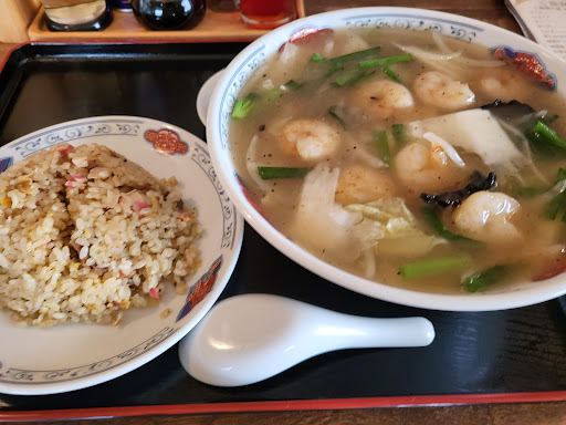 ======================== ペンション風の建物、広い店内で小上がり、カウンター、テーブル席が余裕をもってレイアウトされている。昼時は近隣で働く人がひっきりなしにやってきて、メニューも見ずに注文。常連さんが多そう。 悩んだがエビあんかけ麺とランチセットで小チャーハンをオーダー。これでもかとエビの入ったラーメンは熱々のスープが中太の縮れ麺とよく絡み、少し値は張るが結構美味い。青菜の代わりに入ってるニラはともかく、味の方向を変えちゃってるタマネギはいらないので、タケノコとか入れてもらえるとベターかな。うずらが奥に隠れるように入ってるのもGOOD。たぶん中華丼も同じ感じなので美味いはず。 チャーハンはパラパラ系だけど、厨房の様子を伺う限り毎回いちから作ってはいないようだ。味も旨味が少なくぼんやりしてる。250円で文句付けるなと言われそうだが、よほど空腹でなければ頼まなくていいかな。というか、単品でチャーハン頼んでも同じの出てくるんだろうか…? 餃子や他の品も気に...