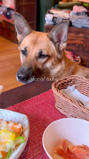 We ordered the grilled toast set with coffee, and while it took a little time to prepare, the result was worth the wait: rustic toast layered with a tangy tomato sauce, softened onions, sausage, and eggs—comfort food with a handmade soul. A small salad and a couple of orange slices rounded out the plate nicely. Midway through, our host quietly returned—not with a bill, but with dog snacks. It was the kind of gesture that lingers longer than any latte art.
