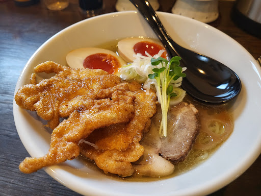 Read more有馬野球場の裏手、住宅街の中にポツンとあるので民家にしか見えない。たぶんご夫婦で営んでいる、知る人ぞ知るといった感じのラーメン屋さん。 雨模様の13時過ぎに行ったら他に客は誰もいなかった。中に入ると「いかにも誰かの家?!」って雰囲気ではなく、白基調の壁にあちこち置物などがあったり、木のインテリアでラーメン屋にしてはおしゃれな作り。小上り、テーブル席、カウンターがあって、席数は意外と多い。小上りの頭上にテレビがあるのは、昔からの食堂っぽさも感じる。 一番人気らしい塩らぁめん(味玉トッピング)と半チャーハンのセットを頼むと、5分程度で着丼。ラーメンはデフォで薄い鶏の唐揚げとレンコンフライがのってるという変わり種。レンコンはともかく唐揚げは個性的すぎてこの上品な塩にはあわないね…。スープは透き通った清湯系だが、もうひとつ深みやパンチがあるといいかな。麺はストレートで細め。量は少なめかも。丁寧に作ってるのは間違いないし、昔は美味かったんだろうけど、今となっては凡庸に感じてしまう…。 チャーハンはパラパラで干しエビ的な旨味を感じた。切れ端をさらに煮込んだかのような茶色いチャーシューがたくさん入っていて220円のセット飯にしては気前がいい。ただこちらもあっさりでさらに上に酸味の強いキムチが乗ってるので、全体的にはう〜んという感じ。次行くならラーメンは六文銭雷らぁめん、チャーハンはやめて餃子とラ...