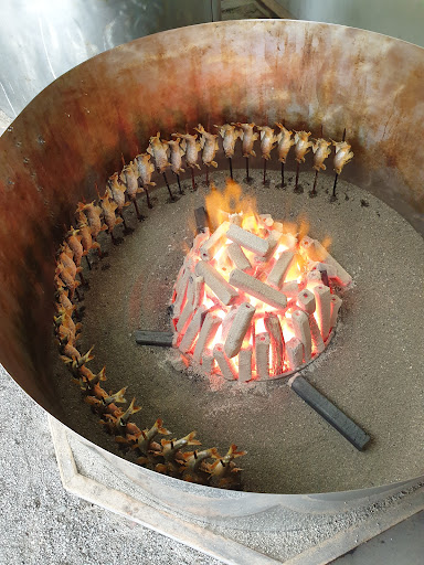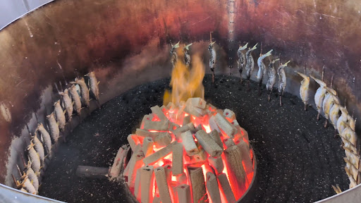 店の入口には、巨大な焼き場があり、大量の炭火の周りで、串刺しされた鮎が焼き上げられる様子を見学出来ます。