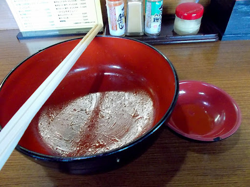 あっさり目な醤油スープが湯気と共に舌に訴える。 旨みを含んだ褐色。おぉ。 なかなか...。 麺を持ち上げる。 少し白っぽいちぢれ麺。 口に運ぶ。 ん!おおぉ。 頭の中で言葉になっている。 (んまいぞ。) 他の具材は... チャーシュー 長ネギ玉ねぎ メンマ わかめ?ほぉ。 チャーシューはホロホロ系。自家製かな。 他の具材はありがち。 ただ。レンゲと箸が交互に止まらない。 あーこれは完飲完食のラーメンなのに、お腹のキャパが!! うまかった。ごちそうさまでした!
