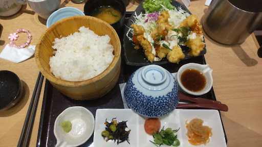 Read moreイオン系列のお店の様子。おひつごはんで、そのまま食べたりだし茶漬けにしたり味を変えながら食べられる。味は普通においしいんだけど。 店内の空調が強かった。お茶は粉を湯飲みに入れてポットからお湯を注ぐ形。お茶の味はおいしいんだけど見た目がものすごく残念…。だし茶漬けの出汁もごはんと一緒にポットで出されるからなんか侘しい気持ちになった。机に無機質なボコボコポット2つも並べてごはん食べるのはなぁ~。せめて出汁くらい必要なときに声かけて小綺麗な容器で出してもらえないのかな。おひつとかはきれいで見た目も拘ってるっぽいのに。お盆の外側のものにも多少拘ってほしい。 お茶と出汁の出し方変えてくれたらいいのに。見た目でかなり損してる。店員も愛想悪い人いたし。いい人もいたけど。他のレストラン街の店舗と比べると人が少ないのも納得。 味と値段は悪くないけど、机に並べる食器等の雰囲...
