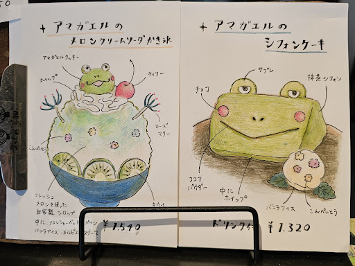 *サルくんのキーマカレー *アマガエルの抹茶シフォンケーキ *アマガエルのメロンクリームソーダかき氷🍧 *カフェラテ *抹茶ラテ *白くまのクリームソーダ *アップルケーキ バナナとブルーベリーのアイスケーキ