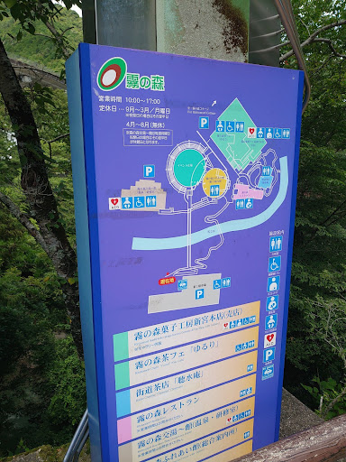 昨年、霧の森大福を目当てに行きました。高松道から高知道に入って程なく走ると、新宮の降り口から、施設の塔のような建物が見えて来ますがなかなか到着しません。時間にして3分程度で要約駐車場に着きました。ふれあいセンターのようなお土産屋の呼び込みを横目に、遊歩橋に掛かれば、そこはもう別世界です。透明な川の水と、小鳥の囀りに、心が洗われるようです。川の中では、親子連れが楽しそうに水遊びをしていました。レストランの開店までに時間があったので、先に霧の森大福を並んで買い求めました。冷凍も有りましたが、直ぐ食べられる方にして車に戻りクーラーボックスに入れましたが、その時も、さっきのように呼び込みを受けました。温泉あり、茶店あり、レストランありで、森林浴だけでなく飽きることがありません。因みに、霧の森大福は早くから並ばずとも買えるようでした。雨や雪がよく降る地域ですので、天候に注意して出掛けることをお勧めします。