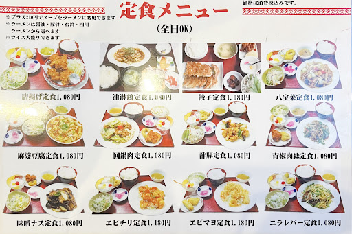 味はとてもよく値段もかなり安い!!そして、出てくるのも速い!! 昼だとラーメンとチャーハンや天津飯が一緒のラーメンセットでお値段750円!もはや価格崩壊気味。もちろんこのラーメンセット、ラーメンも天津飯も普通サイズ。食べきるのが難しい量だ。三人で入店し、二つのラーメンセットを注文するのがいいと思う。 おすすめのメニューは天津飯とエビマヨとラーメン各種。ラーメンは少し平麺で腰がある感じ。好きな人は好きなようだ。豚骨、醤油、四川、台湾と種類があるが四川と台湾はとても辛い。四川は特に辛いので、台湾ラーメンで大丈夫な人だけ注文しましょう。