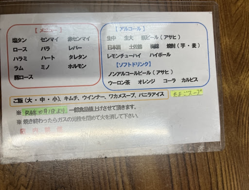 Read more三島界隈のコアファンによって支えられている老舗焼肉店です。 タレがとっても美味しくて焼いた肉にタレをたっぷり絡め白ご飯と一緒に食べるともう病みつきになります。 価格は肉に限っては掲載されるようになりましたが、その他のサイドメニューは未掲載。 価格設定は高くはないけど、安いともいえません。 接客は他のコメントにもあるように客側が店員に気を使うことがあるくらい普通以下なので、接客を重視する人はこの店は避けたほうが良いです。 直近であった出来事だと追加オーダーしようとしたら「団体客が入っているから、あんまり肉頼まない...