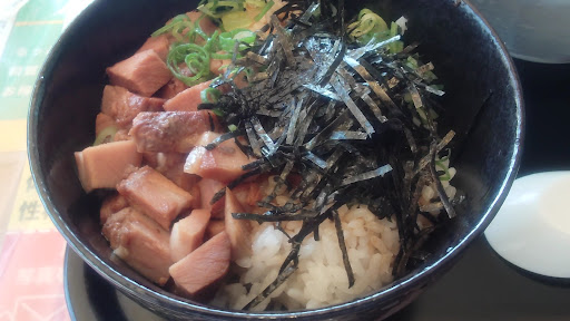 塩ラーメンを注文するとデカい器で出てきて驚いて少し後悔、それにサービス?でチャーシュー丼(チャーシューが少し載ったほぼどんぶり飯)が付いてきて心底後悔。