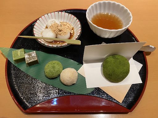 ・おすすめセット(715円) 菓子の盛り合わせ。 団子(黒糖きなこ)、ほうじ茶ゼリー、生チョコ、もりのみ、霧の森大福。 霧の森大福は、無農薬栽培の新宮茶「かぶせ抹茶」を餅に練り込み、外側にもたっぷりまぶした和スイーツ。中にはこし餡と生クリームが入っており、香り豊かなほろ苦の茶の風味と甘みが好相性。