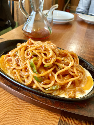 日本のナポリタンとは異なり、 もっちりとした太麺はややアルデンテで、 トマトのソースもめちゃくちゃ美味しい♡ 日本の様なケチャップ味では無く、 酸味のあるソースにしっかりと絡まって、 熱々の鉄板はジュウジュウと、 音を立てて、 とても美味しいナポリタンでした❤️
