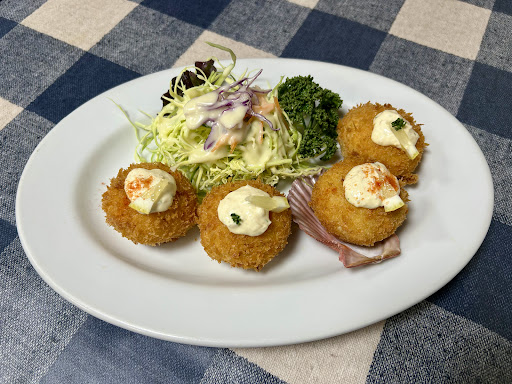 パールコロッケ(4こ) ¥1200込(3こ) 貝のクリームコロッケ メニューでは3こ¥1200込だけど、4こにも変更してもらえる(値段は忘れました) 衣はとても薄くてサクッ 揚げているときに中からクリームが出てこないかと思うくらい 中のクリームはふわっとろっ 貝柱も入っている 貝の風味もクリームソースの味付けもやさしい 上のタルタルソースが合う 上のレモンは爽やかさがプラスされてものすごくおいしい