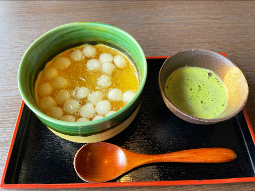 抹茶と寒ざらしのセットをいただいた。 寒ざらしは、大きめの白玉団子に、かなり甘めで蜂蜜や和三盆など奥深い甘さの濃厚な蜜に砕いた氷が入っている。