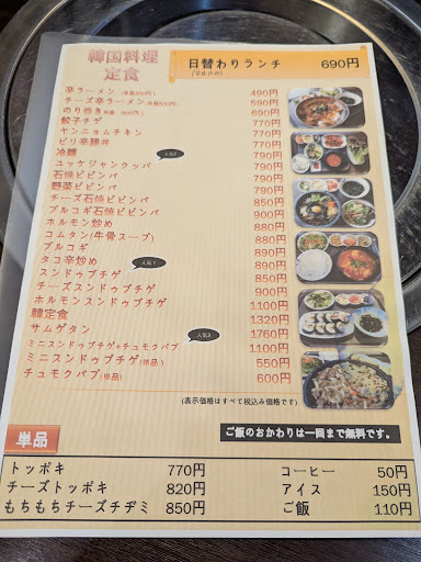 日替わりランチは7月現在、以前より値上がりしており690円、ランチはどれもご飯お代わり一回無料です。 13時前にはなくなることもあるのでお早めに。 ランチにはメイン+バンチャン(韓国の文化のおかずの小皿)、サラダ(メニューによっては汁物)つき。 日替わりが焼肉ランチのときは大当たりです🎉 その時々によって変わりますが大体、牛タン、サムギョプサル、鶏もも、ホルモンなどから数種の盛り合わせです。 店内は椅子か座敷席、幼児用の椅子や食器、絵本もあります。 お店の前には駐車場があり、お一人様も多く気兼ねな...
