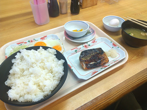 とり天定食を注文するも朝は定食はやってないんだと。 とよく見ると朝定食のメニュー表が張り出されていた。 小皿のサバ塩と生卵を取って飯と味噌汁注文しようとしかけてたから、もう小皿を返さず玉子焼き定食を注文した。 また、食事中に入店してきた客がレギュラーメニューを頼んでいたから退店前に確認したら、朝定食は9時までなのだと。