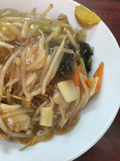 注文したのは餃子と、あんかけかた焼きそば。かた焼きそばは、他の方のレビューもあるとおり、甘めの醤油味が特徴的でした。好き嫌いが分かれるかもしれません。餃子は安定の美味しさ。