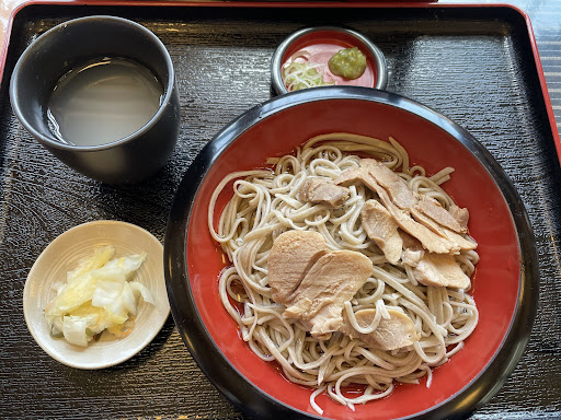 Read moreツアーで立ち寄りました。セルフなのか番号で読んでいたような(添乗員さんが持ってきてくれたのでわかりません)。お茶やお水もセルフのようでした。 お蕎麦は手打ちらしく、硬めです。蕎麦湯が最初からお蕎麦のお膳にお湯呑みに入れられて付いてきます。とろとろで美味しかったです。冷たい地鶏そばを食べました。地鶏は薄くスライスしていますがパサつきがあり、硬めでした。東京のラーメン屋さんで低温調理の地鶏チャーシュー食べたことがありますが、それをイメージするとガッカリします。このお店も低温調理した方がいいと思う。 おネギとわさびのようなものが付いてきましたが、わさびのようなものは、 柚子入りの何かだったのかも。説明がなかったので、見た目が悪かったので口にしませんでした。 つゆは醤油ベースの蕎麦つゆではなく、薄い色の出汁で味はしっかりついているのでしょっぱいくらいです。個人的にはお醤油ベースの蕎麦つゆが蕎麦!って感じで好きです。しょっぱかったので蕎麦つゆはそのままいただいてほっとひと息つけました。白菜の浅漬けが付いていますので塩分は高そうです。 お店は明るく綺麗でした。お蕎麦に何かもう一品付けばいいけど、ランチでも単品でくるので見た目からして物...